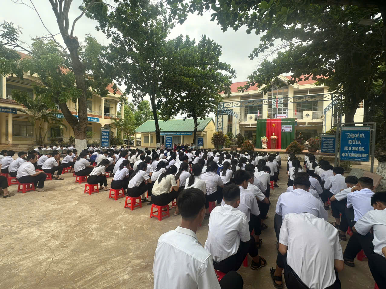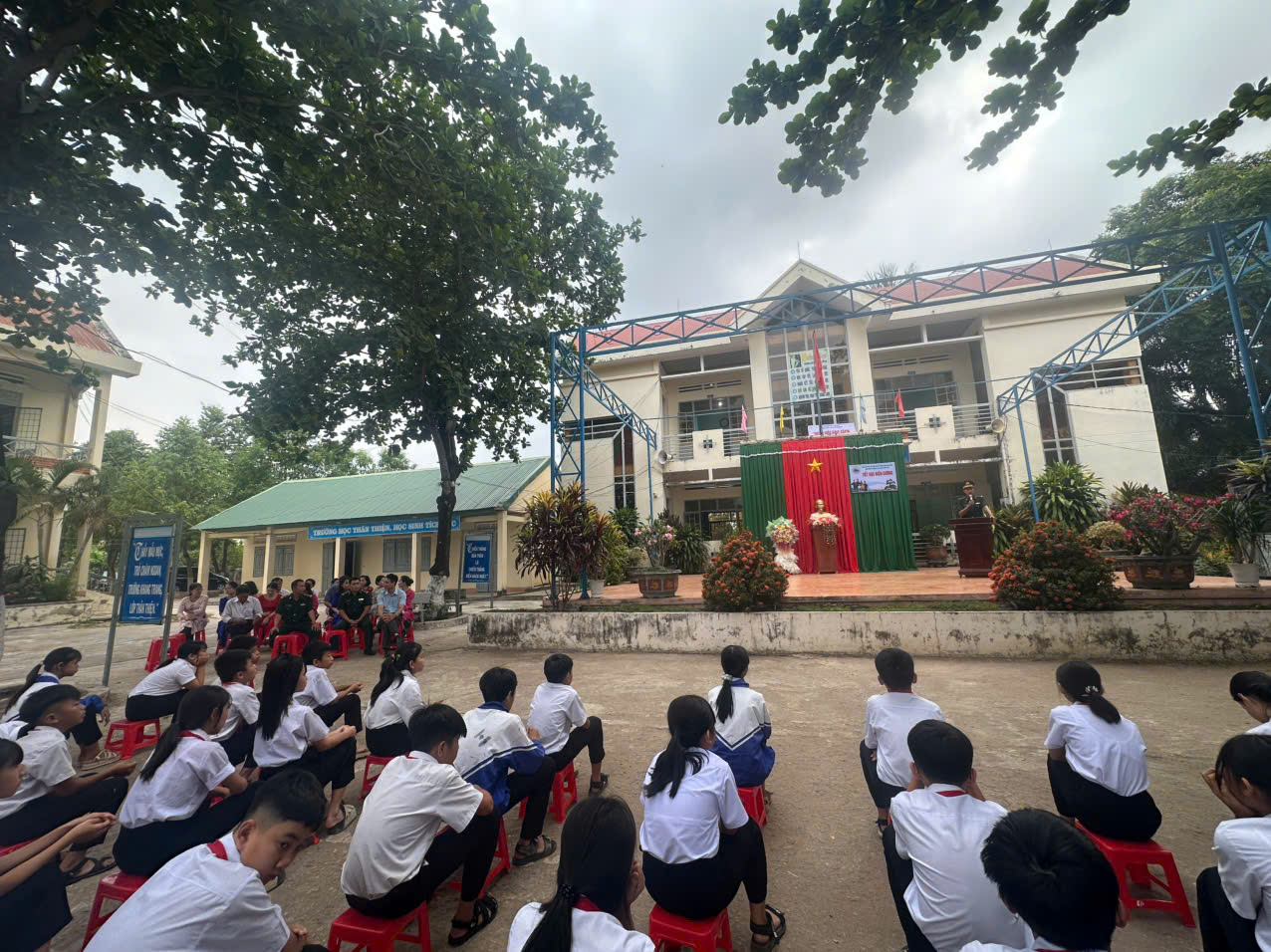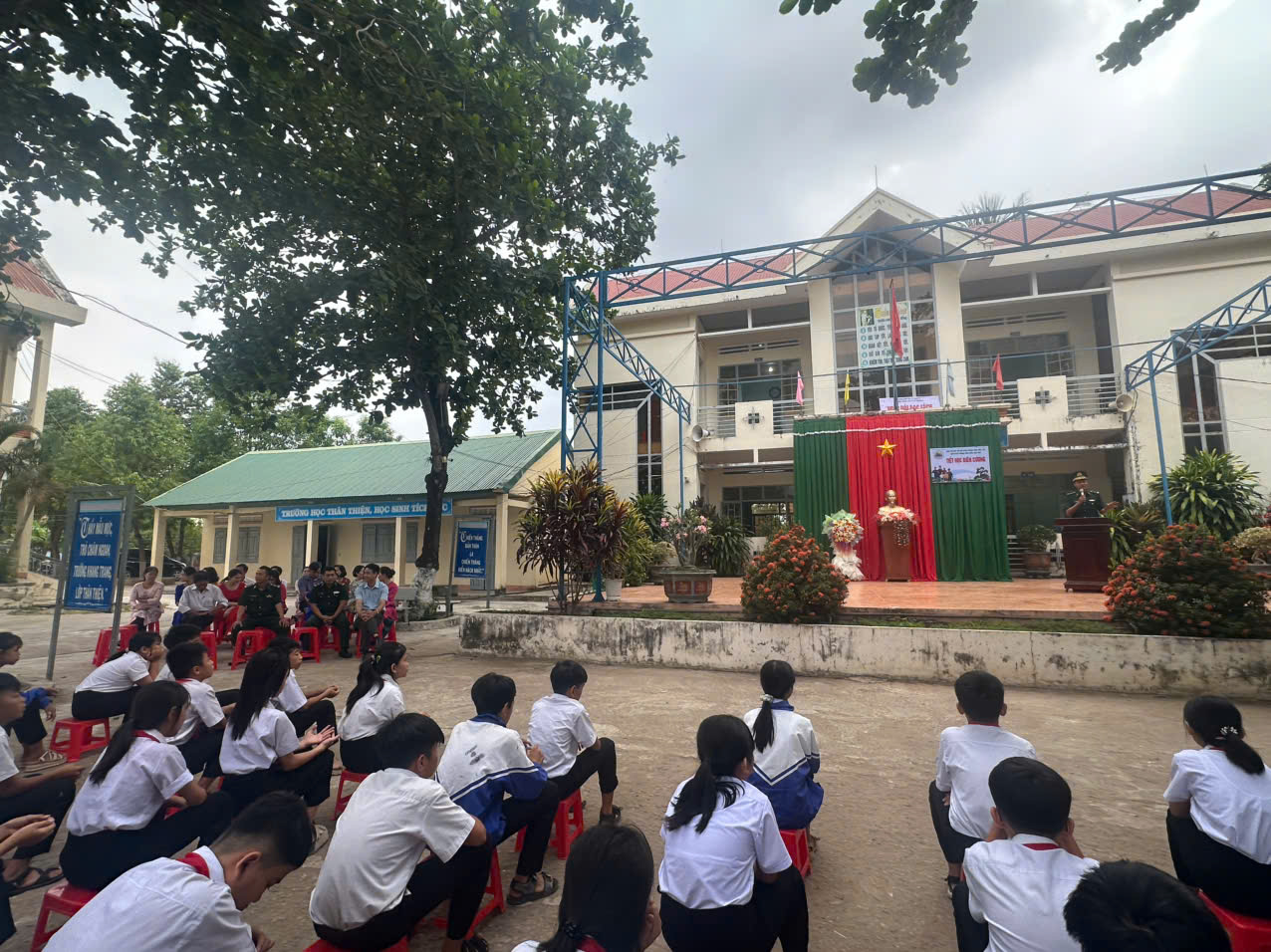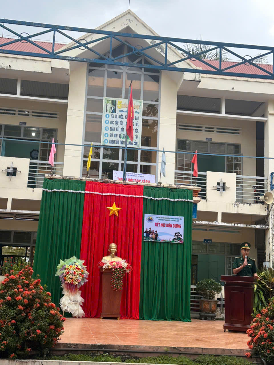 Buổi sinh hoạt diễn ra tại sân trường với sự tham gia của cán bộ, giáo viên và toàn thể học sinh. Đặc biệt, chương trình có sự hiện diện của cán bộ lực lượng vũ trang, trực tiếp chia sẻ những câu chuyện thực tế về cuộc sống, nhiệm vụ của người lính nơi biên cương Tổ quốc.